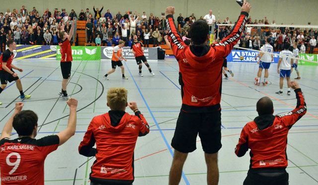 Nach der zehn minütigen Pause konnte sich die TV Waldgirmes etwas absetzen und diesen Vorsprung auch bis Mitte des Satzes halten, ehe Lukas Jaeger zum Aufschlag kam. Mit einer Serie von fünf Aufschlägen brachte er sein Team zurück ins Spiel. Getragen von einer unfassbaren Kulisse fightete der SSC um jeden Punkt. Nach einem erneuten Führungswechsel zugunsten der Gäste war es Zuspieler Fabian Schmidt, der am Ende von Satz Drei mit zwei direkten Assen den SSC mit 24:22 in Front bringen konnte. Mit einem Monsterblock beendete Thorben Sandmeier den Satz in der Verlängerung (26:24). Doch wieder konnten die Hausherren die Spannung nicht oben halten, der Spielverlauf im vierten Satz glich dem des zweiten. Benjamin Loritz wurde aufs Feld geschickt um die Annahme zu stabilisieren. Gegen Mitte des Satzes wurde auch Thomas Heidebrecht im Zuspiel eingewechselt, um frischen Wind ins Spiel zu bringen. Schlussendlich ging der Satz mit 18:25 verloren, es musste also die Entscheidung im Tie-Break her. Nach holprigem Start (2:5) konnte Thomas Heidebrecht mit einer klasse Aufschlagleistung die Mannschaft nach vorne peitschen. Die Kulisse in der sogenannten "Otto-Hahn-Hölle" war der eines Spitzenspiels würdig. Der Geräuschpegel war so laut, dass Gästekapitän Peter Schlecht auf den Schiedsrichterstuhl klettern musste, um überhaupt mit dem Unparteiischen kommunizieren zu können. Von dieser Welle getragen, ließen sich die Karlsruher die Butter nicht mehr vom Brot nehmen. Zum Satzende konnte auch Diagonalangreifer Andrej German wieder erfolgreich punkten, ehe Gästeangreifer Philip Schumann mit einem Aufschlagfehler das Spiel beendete.