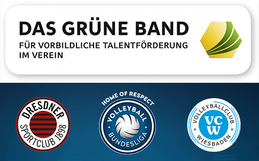 Eine große Ehre wird den Volleyball Bundesligisten VC Wiesbaden und Dresdner SC zuteil: Der Deutsche Olympische Sportbund (DOSB) verleiht beiden Vereinen der 1. Bundesliga der Frauen das "Grüne Band für vorbildliche Talentförderung im Verein". Im Herbst dieses Jahres werden die Verantwortlichen zusammen mit den weiteren Preisträgern offiziell im Rahmen einer Gala ausgezeichnet.