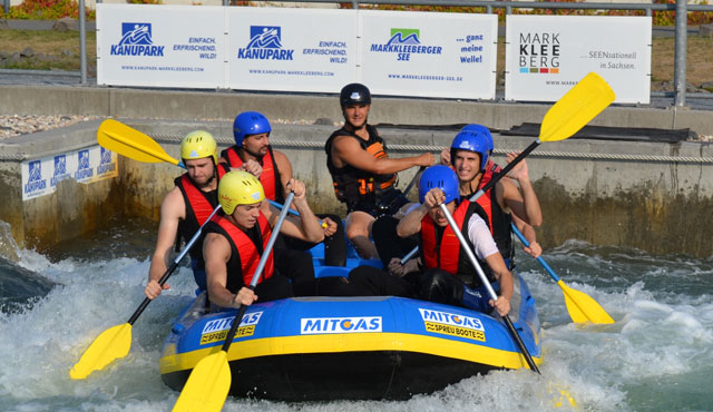 Markkleeberg/Leuna, 14.09.2016. Die 1. Herrenmannschaft des Chemie Volley Mitteldeutschland (CVM) war heute im Kanupark Markkleeberg zu Gast. Cornelia Sommerfeld, Pressesprecherin von MITGAS, übergab dem Verein den Vertrag für die neue Saison. Danach stiegen die Volleyballer in die Schlauchboote, um beim Wildwasser-Rafting ihren Teamgeist zu stärken.