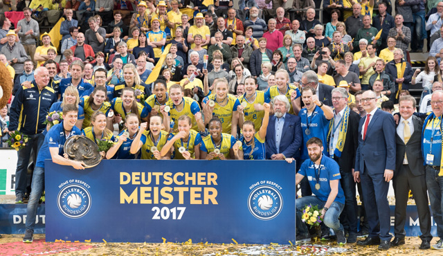 Wenn es am 8. Oktober um den Volleyball Supercup 2017 geht, wird sich erstmals der SSC Palmberg Schwerin in der TUI Arena in Hannover präsentieren. Im Vorjahr in Berlin waren die Volleyballerinnen aus der Landeshauptstadt Mecklenburg-Vorpommerns nicht dabei. Der Grund war eine längere Titel-Durststrecke, die das Team durchleben musste. Drei Spielzeiten holten sich die Norddeutschen weder Pokal noch Meisterschaft, ehe der Knoten wieder platzte. Mit drei Siegen in den Final-Playoffs gegen den Allianz MTV Stuttgart (Best of Five) errang der SSC Palmberg die Meisterschale. Der Jubel im erfolgsverwöhnten Schwerin kannte keine Grenzen.