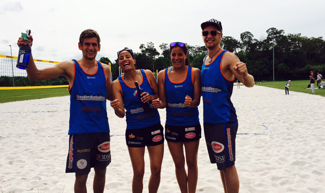 Die Standhardinger Zwillinge (links Kathrin) mit den Sieger der Männerkonkurrenz Beck/Noack (Foto: SV Lohhof)