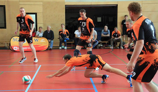 Bildunterschrift: Stefan Fröhlich, Libero der SG PKW, kommt in der Annahme einen Schritt zu spät und verpasst den Ball (Foto: Verein)
