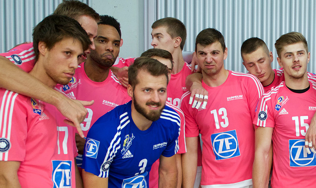 Friedrichshafen (gek). Der ein oder andere Zuschauer dürfte am Mittwochabend mit einem verrenkten Hals aus der ZF Arena nach Hause gegangen sein. Nach dem offiziellen Einschlagen mussten die Spieler des VfB Friedrichshafen ihr blaues Heimspieltrikot nämlich ausziehen und wurden in pinke Trikots gesteckt. "Das ist keine Strafe", sagt Sebastian Schmidt, Geschäftsführer der VfB Friedrichshafen Volleyball GmbH, "wir wollen damit Aufmerksamkeit generieren und das ist uns in den ersten Stunden seit unserer neuen Kampagne definitiv gelungen."