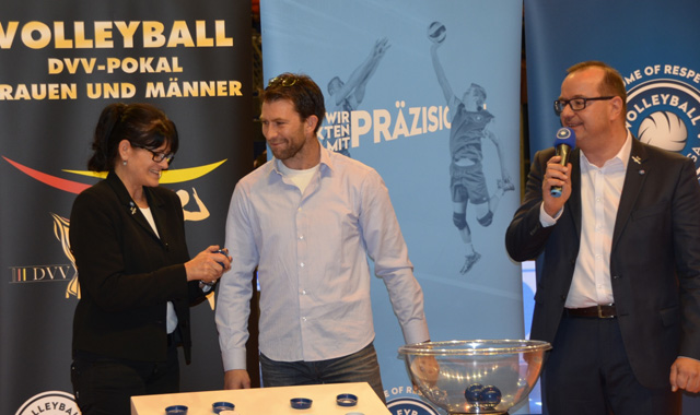 Viola Knospe, Sven Felski und Frank Bleydorn / Sven Felski sorgte als Losfee für ein Heimspiel der Berliner (Foto: VBL)