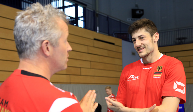 Das Foto zeigt Michael Andrei im Gespräch mit Bundestrainer Vital Heynen (Foto: SWD Powervolleys)