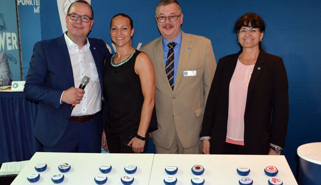 Moderator Frank Bleydorn, Box-Weltmeisterin Ramona Kühne, Bundesspielwart Gerald Kessing und Viola Knospe (VBL-Managerin Spielbetrieb) bei der Auslosung (Foto: VBL)