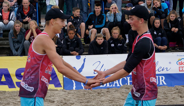 An der Ostsee konnte sich das Bayerische Team nach gewonnenem erstem Satz nicht den Titel holen. Bei der Deutschen Meisterschaft wurde der Spieß umgedreht und erfolgreich Revanche genommen. Die Zuschauer bekamen Beachvolleyball auf ganz hohem Niveau zu sehen. Schon im ersten Satz spielten Jason und Simon gut auf aber die Taktik griff noch nicht (15:11). Im zweiten Satz wurde die Aufschlagtaktik erfolgreich umgestellt und der Gegner vor unlösbaren Aufgaben gestellt was mit dem Satzausgleich belohnt wurde (13:15). Im abschließenden Tiebreak zeigten die beiden Bayern ein variantenreiches Spiel mit Pässen über Kopf und das Ausnutzen der kompletten Feldbreite. Mit einem klaren 15:9 gewannen Sie vor einem großartigen Publikum die Deutsche Meisterschaft. Der Beifall am Schluss galt beiden Teams.