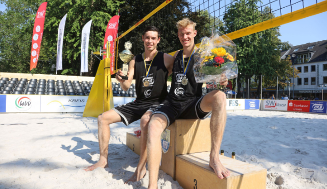Tobias Brand und Jonas Reinhardt gewinnen die westdeutsche Beachvolleyball-Meisterschaft. Das Beach-Team, das für den Hallen-Bundesligisten SWD powervolleys Düren startet, bestätigt den ersten Platz in der Setzliste für den DKB Beach Cup auf dem Schlossplatz in Jülich. Im Finale schlagen die beiden 21-Jährigen Routinier Jan Romund und seinen neuen Mitspieler Niko Meyer (Aasee) mit 2:0 nach Sätzen. Damit geht der Titel des westdeutschen Beachvolleyball-Meisters nach einem stimmungsvollen Turnier in Jülich erstmals nach Düren.