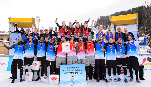 Die Sieger der 3. Deutschen Snow-Volleyball Meisterschaften in Oberstaufen heißen Constanze Bieneck/Lena Overländer/Sarah Overländer/Charlotta Werscheck bei den Frauen und Benedikt Doranth/Julius Höfer/Tim Noack/Fabian Wagner bei den Männern. Beide Teams jubelten vor den Augen von DOSB-Präsident Alfons Hörmann über Gold und die Tickets zu den Europameisterschaften 2020.