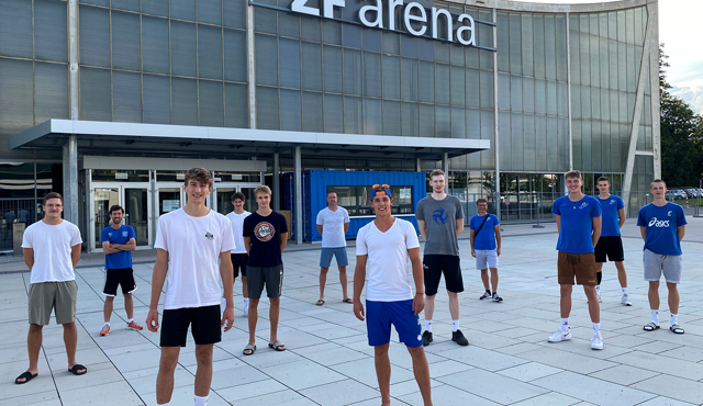 Abschiedsfoto vor der ZF Arena (von links): Leon Zimmermann, Trainer Adrian Pfleghar, Marco Frohberg, Benedikt Waldinger, Jannik Brentel, Co-Trainer Bogdan Jalowietzki, Johann Reusch, Onno Möller, Co-Trainer Jürgen Jammer, Ben-Simon Bonin, Leon Meier und (Foto: Gunthild Schulte-Hoppe)
