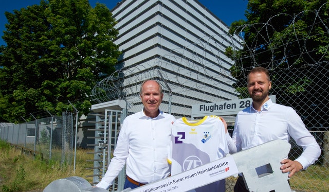 Claus-Dieter Wehr (links) übergibt die Schlüssel zum Hangar R an Thilo Späth-Westerholt