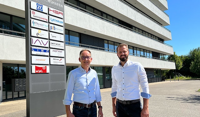 Stefan Nachbaur und Thilo Späth-Westerholt vor dem PRISMA-Gebäude